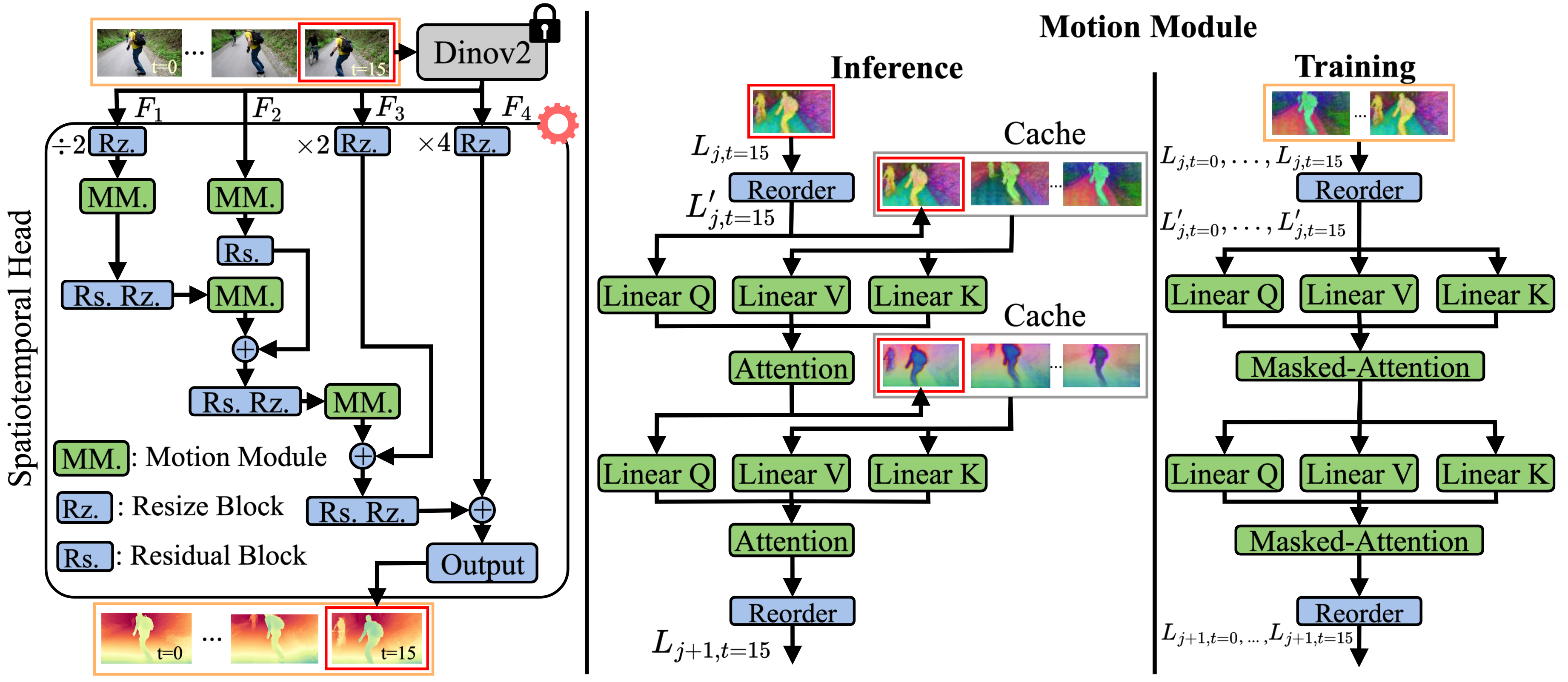 During training, we fine-tune the spatiotemporal head using a masked-attention strategy that restricts